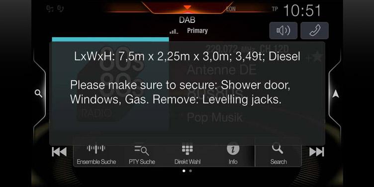 La mayoría de los daños a las autocaravanas o campers ocurren porque el vehículo no estaba completamente preparado para la carretera. La verificación previa al viaje, Pre-Flight Check , en pantalla de Alpine se puede personalizar completamente para su vehículo y le recuerda antes de comenzar a conducir, para asegurarse de que el gas esté cerrado, todas las mesas y puertas estén aseguradas, las antenas satelitales estén retraídas, etc.